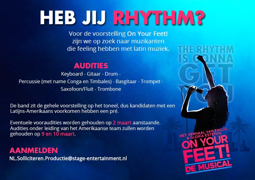 Stage Entertainment is voor On Your Feet! op zoek naar muzikanten die feeling hebben met latin muziek. Het gaat om keyboard, drum, gitaar, percussie (met name conga en timbales), basgitaar, trompet, saxofoon/fluit en trombone.